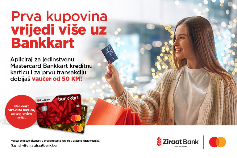 Klijenti koji u periodu promocije od 17.10.2025. do 17.12.2025. godine po prvi put apliciraju za Mastercard kreditnu karticu ZiraatBank BH i obave tom karticom prvu transakciju (POS ili online plaćanje), ostvaruju pravo na poklon vaučer u iznosu od 50 KM za kupovinu na sistemu kupipoklon.ba.